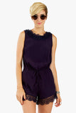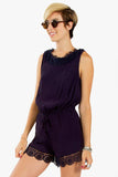 We are obsessed with this navy romper featuring the cutest crochet trim around the neck and hem. Stretch band and drawstring waist. Button closure on back.